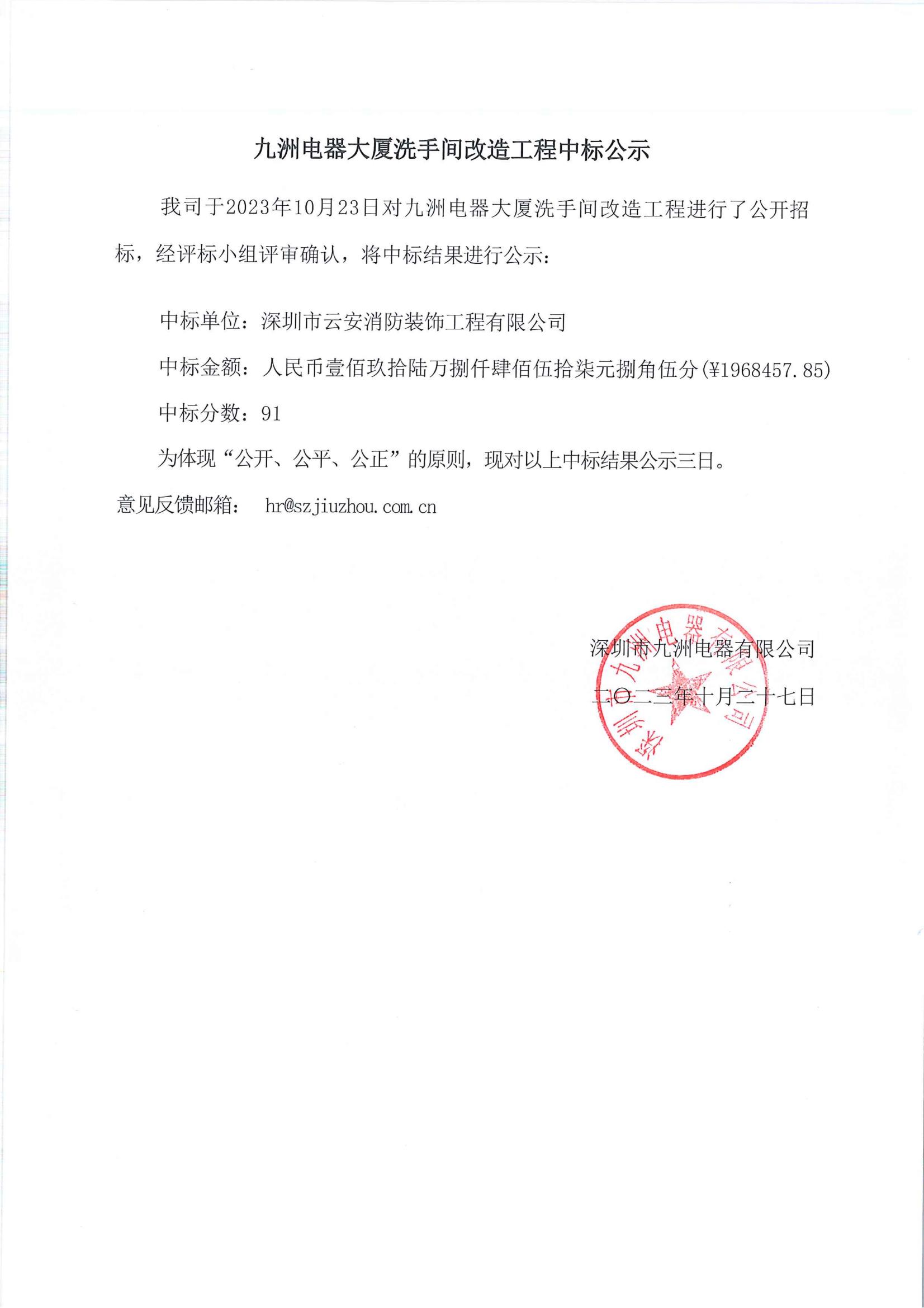 九洲電器大廈洗手間改造工程中標(biāo)公示
