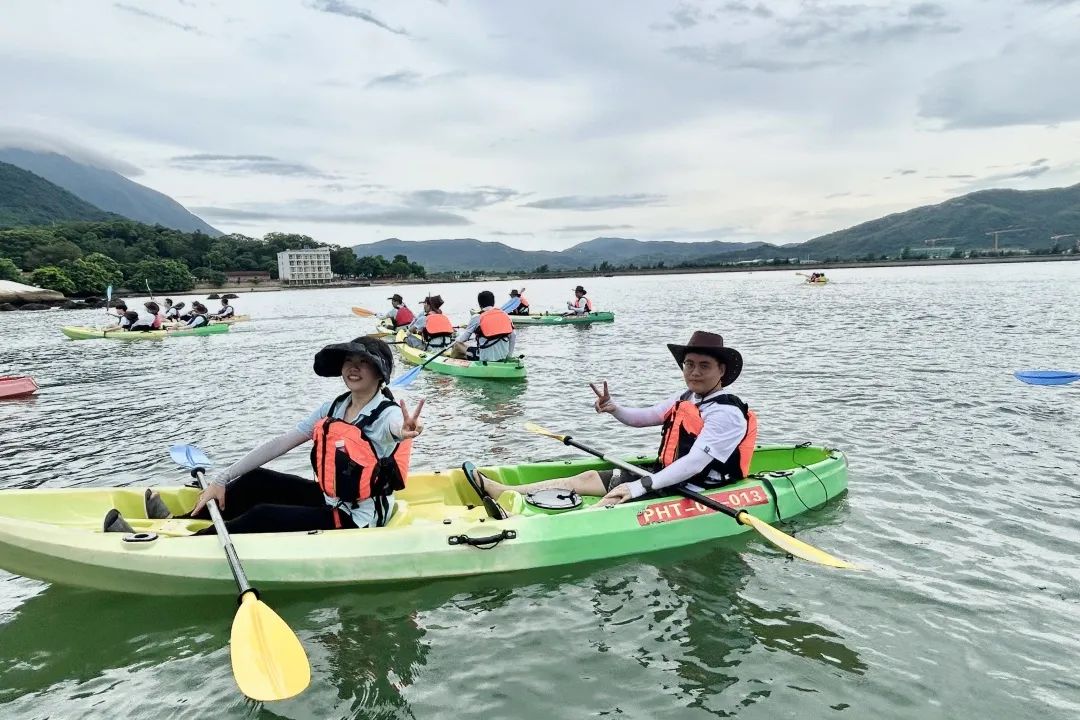 由專業(yè)的皮劃艇教練為大家做皮劃艇專業(yè)動作要領和安全注意事項的培訓,大家認真聆聽并迅速掌握要領。培訓結束后,大家躍躍欲試,穿上救生衣,踏上皮劃艇,撐起長船槳,自由練習,一陣陣歡聲笑語和整齊的“左、右、左、右...”打破了海面的平靜。