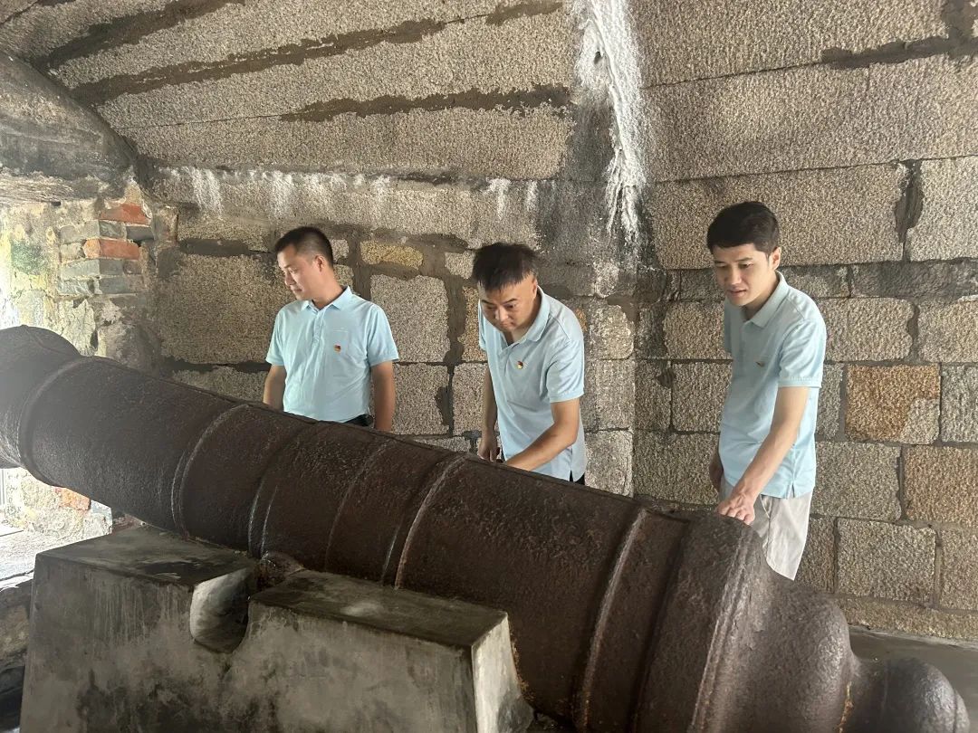 “遙觀碧海出滄灣,滾滾波流過峽關”,平靜的海面曾經炮火紛飛,威遠炮臺歷盡風雨洗禮,黨員們用手輕撫著他,感受著歷史的溫度,是那么蒼涼、悲壯,仿佛愛國英雄關天培誓死守護炮臺、守護國土的一幕重現(xiàn)。